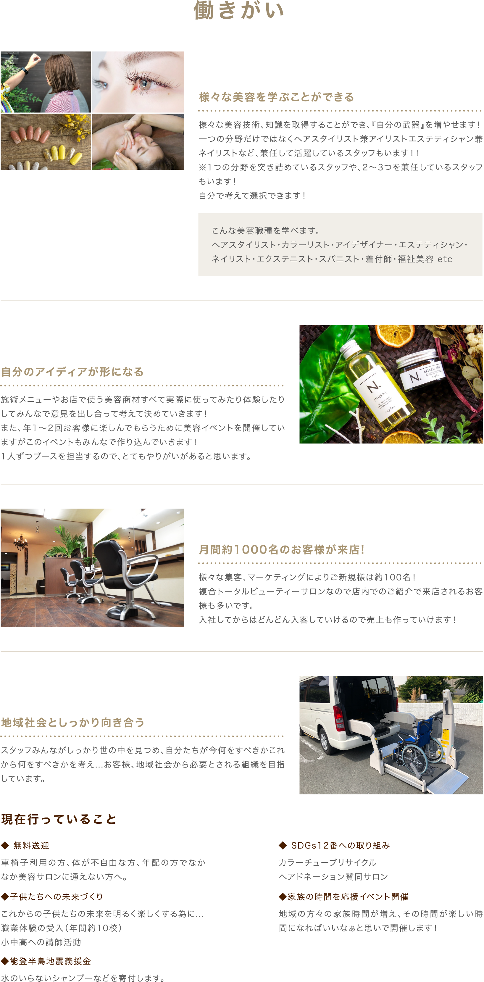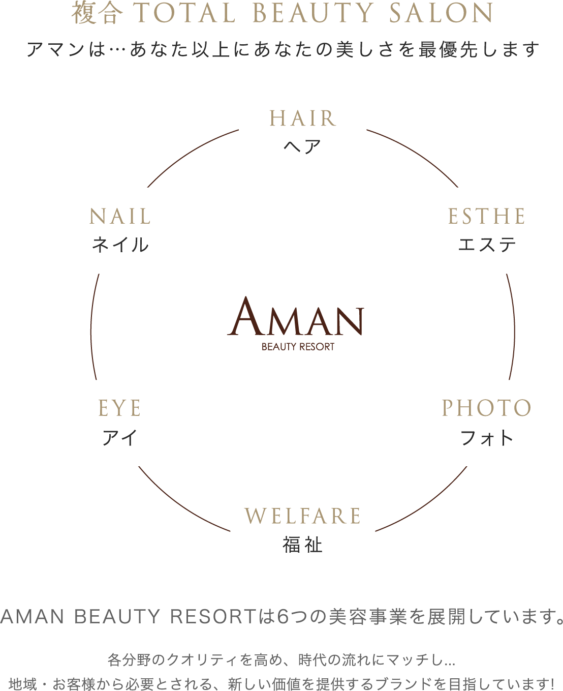 アマンビューティーリゾートには6つのブランドがあり、様々な技術や知識を学ぶことができます。得意なことや興味のあることを伸ばし、個々の力を伸ばすことで、『あなたらしく』活躍することができます。